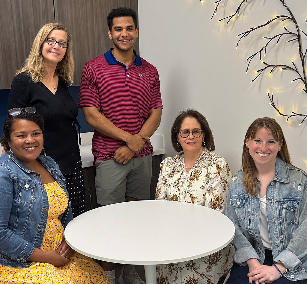 Zamir Maze, Marketing Project Assistant is back row right and manages staff bios for the Staff Lounge and attends Health Council meetings. He splits his time with us and facilities.